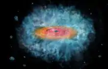 The gravitational collapse of heavy stars is assumed to be responsible for the formation of stellar mass black holes. Star formation in the early universe may have resulted in very massive stars, which upon their collapse would have produced black holes of up to 103 M☉. These black holes could be the seeds of the supermassive black holes found in the centres of most galaxies.[130] It has further been suggested that massive black holes with typical masses of ~105 M☉ could have formed from the direct collapse of gas clouds in the young universe.[125] These massive objects have been proposed as the seeds that eventually formed the earliest quasars observed already at redshift .[131] Some candidates for such objects have been found in observations of the young universe.[125]