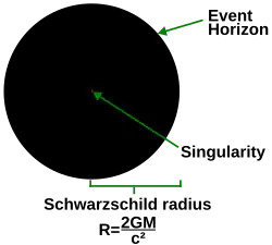 In 1931, Subrahmanyan Chandrasekhar calculated, using special relativity, that a non-rotating body of electron-degenerate matter above a certain limiting mass (now called the Chandrasekhar limit at 1.4 M☉) has no stable solutions.[25] His arguments were opposed by many of his contemporaries like Eddington and Lev Landau, who argued that some yet unknown mechanism would stop the collapse.[26] They were partly correct: a white dwarf slightly more massive than the Chandrasekhar limit will collapse into a neutron star,[27] which is itself stable. But in 1939, Robert Oppenheimer and others predicted that neutron stars above another limit (the Tolman–Oppenheimer–Volkoff limit) would collapse further for the reasons presented by Chandrasekhar, and concluded that no law of physics was likely to intervene and stop at least some stars from collapsing to black holes.[28] Their original calculations, based on the Pauli exclusion principle, gave it as 0.7 M☉; subsequent consideration of neutron-neutron repulsion mediated by the strong force raised the estimate to approximately 1.5 M☉ to 3.0 M☉.[29] Observations of the neutron star merger GW170817, which is thought to have generated a black hole shortly afterward, have refined the TOV limit estimate to ~2.17 M☉.[30][31][32][33][34] Oppenheimer and his co-authors interpreted the singularity at the boundary of the Schwarzschild radius as indicating that this was the boundary of a bubble in which time stopped. This is a valid point of view for external observers, but not for infalling observers. Because of this property, the collapsed stars were called "frozen stars", because an outside observer would see the surface of the star frozen in time at the instant where its collapse takes it to the Schwarzschild radius.[35]