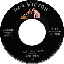 "Blue Suede Shoes" was the opening track on the groundbreaking album Elvis Presley, which was released in March. RCA Victor released two other records with "Blue Suede Shoes" the same month: an extended play with four songs (RCA Victor EPA 747) and a double extended play with eight songs (RCA Victor EPB 1254). RCA Victor released the Presley version as a single on September 8, one of a number of singles RCA issued simultaneously, all culled from the album Elvis Presley. This single reached number 20, whereas Perkins' version had topped the chart. In 1999, Presley's version was certified as a gold record by the Recording Industry Association of America (RIAA),[32] while in 2023, the British Phonographic Industry (BPI) certified the song silver for sales and streaming figures exceeding 200,000 units.[33]