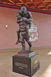 In January 2020, a statue which depicts a scene from 1968, when Paisley carried the injured future Liverpool captain Emlyn Hughes off the field, was unveiled outside Anfield. The plinth features a quote from Paisley: "This Club has been my life; I'd go out and sweep the street and be proud to do it for Liverpool FC if they asked me to."[32] The 8 ft sculpture was unveiled by some of Paisley's players, including Ian Rush, Sir Kenny Dalglish and Phil Thompson, with Liverpool chief executive Peter Moore calling it a "fitting tribute to his legacy".[32] Paisley also features in the popular Liverpool chant "Allez, Allez, Allez", which is frequently sung by Liverpool supporters, especially during European matches.[33]