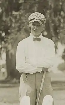 He was influenced by club professional Stewart Maiden, a native of Carnoustie, Scotland. Maiden was the professional at the Atlanta Athletic Club's East Lake Golf Club, who also trained Alexa Stirling, the three-time winner of the U.S. Women's Amateur, who was five years older than Jones but also a prodigy at East Lake.[10] Jones also received golf lessons from Willie Ogg when he was in his teenage years.[11] Jones played frequently with his father, a skilled golfer himself. The younger Jones sometimes battled his own temper on the course, but later controlled his emotions as he became more experienced.[12] Jones toured the U.S. during World War I from 1917 to 1918, playing exhibition matches before large crowds, often with Alexa Stirling and Perry Adair, to generate income for war relief. Playing in front of such crowds in these matches helped him, as he moved into national competition a bit later on.
