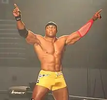 Lashley regained the championship on January 7, 2015, after interference from MVP, King, Samoa Joe and Low Ki, as well as Eric Young turning on Roode.[70] On the June 3 episode of Impact Wrestling, Lashley defeated Eric Young after Chris Melendez distracted Young. At Slammiversary on June 28, Lashley teamed with Mr. Anderson against Ethan Carter III and Tyrus in a losing effort. On the August 12 episode of Impact Wrestling, Lashley defeated Jessie Godderz in a qualifying match for the King of the Mountain match for the vacant TNA King of the Mountain Championship, which was won by PJ Black.[71] On the August 26 episode of Impact Wrestling, Lashley competed in a four-way match for a shot at King of the Mountain Championship, which was won by Bobby Roode.[72] On the September 16 episode of Impact Wrestling, Team TNA (Lashley, Drew Galloway, Davey Richards, Eddie Edwards and Bram) defeated Team GFW (Jeff Jarrett, Eric Young, Chris Mordetzky, Brian Myers and Sonjay Dutt) in a Lethal Lockdown match. On October 4 at Bound for Glory, Lashley unsuccessfully challenged Bobby Roode for the TNA King of the Mountain Championship.[73] During October and November, Lashley began competing in the TNA World Title Series for the opportunity to win the vacant TNA World Heavyweight Championship, where he ended second in his block to successfully advance to round 16 where he defeated Drew Galloway to advance into the quarterfinals and Mahabali Shera to advance the semifinals, but he failed to qualify for the finals when he was defeated by the eventual winner Ethan Carter III.