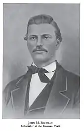 John Bozeman, with Daniel Rouse and William Beall, platted the town in August 1864, stating "standing right in the gate of the mountains ready to swallow up all tenderfeet that would reach the territory from the east, with their golden fleeces to be taken care of."[14] Red Cloud's War closed the Bozeman Trail in 1868, but the town's fertile land still attracted permanent settlers.