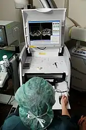 Imaging techniques, such as x-ray, fluoroscopy and ultrasound are typically used to help guide the placement of the applicators to their correct positions and to further refine the treatment plan.[1]: Ch. 5 CAT scans and MRI can also be used.[1]: Ch. 5 Once the applicators are inserted, they are held in place against the skin using sutures or adhesive tape to prevent them from moving. Once the applicators are confirmed as being in the correct position, further imaging can be performed to guide detailed treatment planning.[1]: Ch. 5