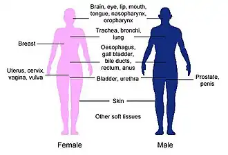Brachytherapy can also be used in the treatment of tumours of the brain, eye, head and neck region (lip, floor of mouth, tongue, nasopharynx and oropharynx),[10] respiratory tract (trachea and bronchi), digestive tract (oesophagus, gall bladder, bile-ducts, rectum, anus),[11] urinary tract (bladder, urethra, penis), female reproductive tract (uterus, vagina, vulva), and soft tissues.[1]