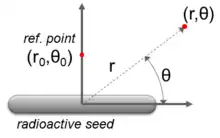 The calculation of radiation dose from radioactive seeds is crucial in the planning and administration of brachytherapy treatments. Most modern calculation are done using the formalism published by the American Association of Physicists in Medicine.[83] For the geometry in figure 1, this formalism uses five parameters.