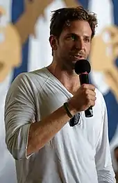 Cooper missed his MFA graduation ceremony to film Wet Hot American Summer (2001), an ensemble comedy that marked his cinematic debut. Taking place at a fictional summer camp in 1981, the film had him play Ben, a counselor and the love interest of Michael Ian Black's character.[29] Although the film was critically and commercially unsuccessful, it has since developed a cult following. Cooper reprised the role in the film's prequel Wet Hot American Summer: First Day of Camp (2015), an eight-episode Netflix series.[30]