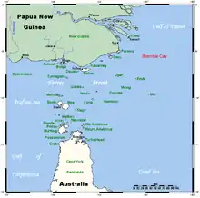 The Bramble Cay melomys was described in 2002 as Australia's most isolated mammal.[15][17] The cay is located in the northeastern portion of the Torres Strait, approximately 50 kilometres (31 mi) from the mouth of the Fly River in Papua New Guinea. The cay is between 4 and 5 hectares (9+7⁄8 and 12+3⁄8 acres), but the rodent only occupied the vegetated portion of the island, measuring approximately 2 hectares (5 acres).[15] The vegetation of the island comprises grasses and herbs, generally shorter than 0.4 metres (1 ft 4 in).
