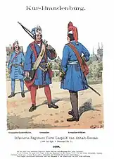 Initially, the estates' contributions were limited to six years, yet the Frederick William obliged the estates to continue the payments thereafter and created a dedicated office to collect the contributions.[28] The contributions were confirmed by the estates in 1662, but transformed in 1666 by decree from a real estate tax to an excise tax.[28] Since 1657, the towns had to contribute not soldiers, but monetary payments to the army, and since 1665, the estates were able to free themselves from contributing soldiers by additional payments.[28] The initial army size of 8,000 men[29] had risen to 25,000[12] to 30,000 men by 1688.[29] By then, Frederick William had also accomplished his second goal, to finance the army independently of the estates.[12] By 1688, these military costs amounted to considerable 1,500,000 talers or half of the state budget.[12] Ensuring a solid financial basis for the army, undisturbed by the estates, was the foremost objective of Frederick William's administrative reforms.[30] He regarded military success as the only way to gain international reputation.[13]