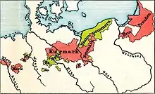 By 1678, Frederick William had cleared Swedish Pomerania and occupied most of it, with the exception of Rügen which was held by Denmark–Norway.[42] This was followed by another success against Sweden, when Frederick William cleared Prussia of Swedish forces in what became known as the Great Sleigh Drive.[47] However, when Louis XIV of France concluded the Dutch War by the Nijmegen treaties, he marched his armies east to relieve his Swedish ally, and forced Frederick William to basically return to the status quo ante bellum by the Treaty of Saint-Germain-en-Laye (1679).[38] Though the Scanian War resulted only in minor territorial gains, attaching a small strip of the Swedish Pomeranian right bank of the lower Oder to Brandenburg-Prussian Pomerania, the war resulted in a huge gain of prestige for the elector.[40]