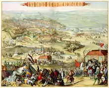 Polish king John III Sobieski planned to restore Polish suzerainty over the Duchy of Prussia, and for this purpose concluded an alliance with France on 11 June 1675.[43] France promised assistance and subsidies, while Sobieski in turn allowed French recruitment in Poland-Lithuania and promised to aid Hungarian rebel forces who were to distract the Habsburgs from their war against France.[43] For this plan to work out, Poland-Lithuania had to first conclude her war against the Ottoman Empire, which French diplomacy despite great efforts failed to achieve.[44] Furthermore, Sobieski was opposed by the Papacy, by Polish gentry who saw the Ottomans as the greater threat, and by Polish magnates bribed by Berlin and Vienna.[45] Inner-Polish Catholic opposition to an intervention on the Protestant Hungarian rebels' side added to the resentments.[46] Thus, while Treaty of Żurawno ended the Polish-Ottoman war in 1676, Sobieski sided with the emperor instead,[46] and the plan for a Prussian campaign was dropped.[45]