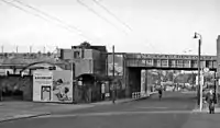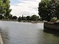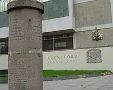 An amateur local history and an inscription outside the County Court claim that Julius Cæsar crossed the Thames here during his invasion of Britain in 54 BC, and fought a battle with Cassivellaunus close by.[6] Cæsar describes the place as fortified with sharp stakes. The discovery of sharp stakes in the river-side at Brentford Dock in the early 20th century was taken by Montagu Sharpe as evidence of a fortified crossing-site, and Caesar's battle.[7] The stakes were removed as a hazard to river-traffic, and Sharpe's claims are not supported by further excavations.