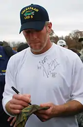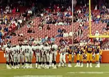 After high school, Southern Mississippi offered Favre a football scholarship at the urging of assistant coach McHale, which was the only one he received.[13] Southern Miss wanted him to play defensive back, but Favre wanted to play quarterback instead. Favre began his freshman year as the seventh-string quarterback and took over the starting position in the second half of the third game of the year against Tulane on September 19, 1987. Favre, despite suffering a hangover from the night before and vomiting during warm-ups, led the Golden Eagles to a come-from-behind victory with two touchdown passes.[14] Favre started ten games during his freshman year and won six of them.[15]