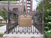 Before his death in Salt Lake City on August 29, 1877,[148] Young suffered from cholera morbus and inflammation of the bowels.[149] It is believed that he died of peritonitis from a ruptured appendix.[2] His last words were "Joseph! Joseph! Joseph!", invoking the name of the late Joseph Smith Jr., founder of the Latter Day Saint movement.[150] On September 2, 1877, Young's funeral was held in the Tabernacle with an estimated 12,000 to 15,000 people in attendance.[151] He is buried on the grounds of the Mormon Pioneer Memorial Monument in the heart of Salt Lake City. A bronze marker was placed at the grave site June 10, 1938, by members of the Young Men and Young Women organizations, which he founded.[152]