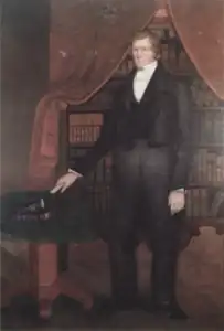 By the time Young moved to Mendon in 1828, he had effectively left the Reformed Methodist Church and become a Christian seeker, unconvinced that he had found a church possessing the true authority of Jesus Christ.[15] Sometime in 1830, Young was introduced to the Book of Mormon by way of a copy that his brother, Phineas Howe, had obtained from Samuel H. Smith. Young did not immediately accept the divine claims of the Book of Mormon.[16] In 1831, five missionaries of the Latter Day Saint movement—Eleazer Miller, Elial Strong, Alpheus Gifford, Enos Curtis, and Daniel Bowen—came from the branch of the church in Columbia, Pennsylvania, to preach in Mendon. A key element of the teachings of this group in Young's eyes was their practicing of spiritual gifts like speaking in tongues and prophecy. This was partly experienced when Young traveled with his wife, Miriam, and Heber C. Kimball to visit the branch of the church in Columbia. After meeting Joseph Smith, Young joined the Church of Christ in April 9, 1832.[17][18] He was baptized by Eleazer Miller. Young's siblings and their spouses were baptized that year or the year afterwards.[19] In April 1832, a branch of the church was organized in Mendon; eight of the fifteen families were Youngs.[20] There, Young saw Alpheus Gifford speak in tongues, and in response, Young also spoke in tongues.[21] Young and Kimball spent the summer following their baptism conducting missionary work in western New York, while Vilate Kimball cared for Young's family. After Miriam died of consumption, Vilate continued to care for Brigham's children while he, Heber, and Joseph Young traveled to visit Joseph Smith in Kirtland, Ohio.[22] During the visit, Brigham spoke in a tongue that Smith identified as the "Adamic language".[21]
