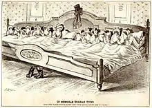 Though polygamy was practiced by Young's predecessor, Joseph Smith,[111] the practice is often associated with Young. Some Latter Day Saint denominations, such as the Community of Christ, consider Young the "Father of Mormon Polygamy".[112] In 1853, Young made the church's first official statement on the subject since the church had arrived in Utah. Young acknowledged that the doctrine was challenging for many women, but stated its necessity for creating large families, proclaiming: "But the first wife will say, 'It is hard, for I have lived with my husband twenty years, or thirty, and have raised a family of children for him, and it is a great trial to me for him to have more women;' then I say it is time that you gave him up to other women who will bear children."[113] Young believed that sexual desire was given by God to ensure the perpetuation of humankind and believed sex should be confined to marriage.[114]