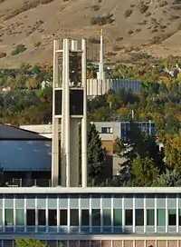 The main campus in Provo, Utah, sits on approximately 560 acres (2.3 km2) nestled at the base of the Wasatch Mountains and includes 295 buildings.[32] The buildings feature a wide variety of architectural styles, each building being built in the style of its time.[33] The grass, trees, and flower beds on BYU's campus are impeccably maintained.[34][35] Furthermore, views of the Wasatch Mountains, (including Mount Timpanogos) can be seen from the campus.[32] BYU's Harold B. Lee Library (also known as "HBLL"), which The Princeton Review ranked as the No. 1 "Great College Library" in 2004,[36] has approximately 8.5 million items in its collections, contains 98 miles (158 km) of shelving, and can seat 4,600 people.[37] The Spencer W. Kimball Tower is home to several of the university's departments and programs and for a long time was the tallest building in Provo, Utah,[38][39] and the Marriott Center serves primarily as a basketball arena and can seat over 19,000, making it the tenth largest on-campus arena in the nation.[40] On Sundays, nearly all of the buildings on campus are utilized to host church services.[41][42]