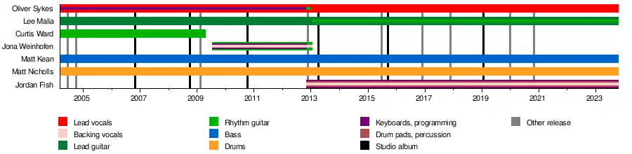 During the Taste of Chaos tour in March of that year, guitarist Curtis Ward left the band.[25] His relationship with the band had deteriorated as his stage performances were poor. He was abusive to audiences during the Taste of Chaos tour,[15] and had contributed little to the writing of Suicide Season.[12] Another reason for his departure was the worsening tinnitus in his one functioning ear. Ward was born deaf in one ear and admitted playing in the band worsened the ringing in his other ear to such a degree that he was unable to sleep at night.[26] Ward offered to perform the rest of the tour dates, which the band rejected and instead asked their guitar technician, Dean Rowbotham, to substitute for him for the remaining performances.[15] Lee Malia noted that Ward's departure helped improve everyone's mood as he had been very negative.[15] Within a week of the tour finishing, Sykes began talking to Jona Weinhofen, at the time the guitarist of Bleeding Through. The band knew of him from his work with his former band I Killed the Prom Queen,[15] and he was asked to join them.[27] Ward has since worked on the TV show Top Gear,[28] and has occasionally performed on stage with Bring Me The Horizon, playing "Pray For Plagues", most notably at Wembley Arena in 2015.[29] In 2016, it was announced that Ward had joined the band Counting Days.[30]