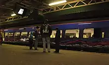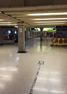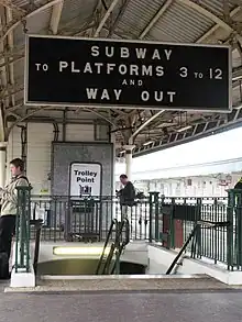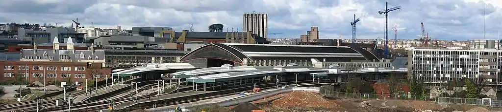 In the late 1960s the Royal Mail built a mail conveyor at the northern end of the station, with significant aesthetic impact. This was out of use for many years following the transfer of Royal Mail's activities to the West of England Mail Centre at Filton and the opening of the short-lived Railnet Hub next to Bristol Parkway station in May 2000.[23] It was finally dismantled in stages and removed between October and December 2014.[24] In 1990/91, £2 million was spent by InterCity on a renovation of the main train shed and another £7 million on restoring some of the older areas of the station, including the refurbishment of the subway and construction of new retail outlets. The shorter of the two 1935 platform islands had been used only for parcels traffic since the 1960s but was temporarily brought back into passenger use during this work. It was fully restored for passenger use in 2001.[17]