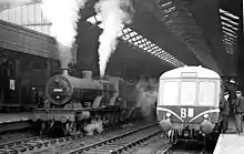 During World War II the station was bombed, which led to the destruction of the wooden spire of the clock tower above the ticket office on 3 January 1941.[17] Gas lighting was replaced by fluorescent electric lights in 1960.[16]
