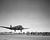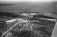 Elmhirst suggested that a site might be found in Groote Eylandt in the Gulf of Carpentaria or north of Emu Field, where it could be connected by road and rail to Oodnadatta, and where water could more easily be found than at Emu Field.[21] Stevens rated both as unsuitable; Groote Eylandt was wooded and rocky, with a pronounced rainy season, no port facilities, and a long way from the nearest major settlements of Darwin and Cairns; while the area north of Emu Field had scarce water, few roads and was on the axis of the Long Range Weapons Establishment (LRWE), which meant that there would be a competing claim on the use of the area.[22] Group Captain George Pither conducted an aerial survey of the area north of the Trans-Australian Railway between Ooldea and Cook, South Australia. This was followed by a ground reconnaissance in four land rovers and two four-wheel drive trucks by Pither, Wing Commander Kevin Connolly, Frank Beavis (an expert in soil chemistry), Len Beadell and the two truck drivers.[23][24] An area was found north of Ooldea, and a temporary airstrip was created in two days by land rovers dragging a length of railway line to level it, where Penney, Flight Lieutenant Charles Taplin and Chief Scientist Alan Butement landed in a Bristol Freighter on 17 October 1953, two days after the Totem 1 test at Emu Field.[25]