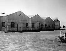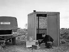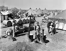 The task force, which began assembling in February 1956, included a section from the Royal Australian Survey Corps,[41] a troop of the 7th Field Squadron, detachments from the Royal Australian Navy (RAN) and Royal Australian Air Force (RAAF), and a civilian from the Department of Works and Housing. Their first task was establishing their own camp, with tents, showers and toilets.[42] A team from the South Australian Department of Mines sank a series of 90-to-350-metre (300 to 1,150 ft) bores to provide water. Like that at Emu Field, the bore water was brackish. Two Army skid-mounted 11-kilolitre-per-day (3,000 US gal/d) Cleaver-Brooks thermocompression distillation units provided water for drinking and cooking.[42][43] Work on the facilities themselves got off to a slow start, as KCG was running behind schedule, and unable to release promised earthmoving plant.[42] Some graders were used by day by KCG and by night by the task force. A call to Blomfield resulted in a grader being shipped from Adelaide to Watson two days later. The arrival of a 23-man detachment of the Radiation Detection Unit of the Corps of Royal Canadian Engineers was expedited so they arrived in June, and were able to pitch in with the construction effort.[44] In July, supplies coming from the UK were delayed by industrial action at the port of Adelaide.[42][45]