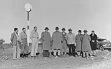 The interdepartmental Atomic Trials Executive in London, chaired by Lieutenant General Sir Frederick Morgan, assumed responsibility for both Operation Mosaic and Operation Buffalo, sitting as the Mosaic Executive (Mosex) or Buffalo Executive (Buffalex) as appropriate.[63] Sir William Penney was appointed scientific director for Operation Buffalo, with Roy Pilgrim, the head of Aldermaston's Trials Division, as his deputy. Group Captain Cecil (Ginger) Weir was appointed Task Force Commander.[64][65] Planning was completed by June 1956. Except for the air drop, all tests were scheduled for 07:00 Central Standard Time. About 1,350 personnel would be present, including 200 scientists from Aldermaston and Harwell, 70 from other UK departments, 50 Canadians and 30 Australians. There would be 500 RAF and RAAF personnel, and 250 Australian Army servicemen to run the camp. Observers would include politicians, journalists, and six American officials,[64] including Major General Leland S. Stranathan from the Armed Forces Special Weapons Project, Alvin C. Graves from the Los Alamos Scientific Laboratory, Frank H. Shelton from Sandia Laboratories and Brigadier General John G. Shinkle from the White Sands Missile Range.[66]