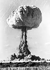 The UK had considerable experience with barrage balloons during the Second World War but the proposed use of balloons to carry warheads to a higher altitude than achievable with a tower was an innovation for Operation Antler. Use of balloons did away with the engineering effort to build towers, and allowed a test site to be re-used, saving on the effort to construct instrumentation sites and lay cables. Most importantly, whereas low-level detonations sucked up contaminated radioactive dirt from the ground and the vaporised tower, a high-altitude detonation created fallout only from the bomb itself, and were therefore much cleaner.[97] While accepting this point, the AWTSC was apprehensive about the consequences of a runaway balloon carrying a live atomic bomb.[98] Bill Saxby and J. T. Tomblin from Aldermaston and an RAF balloon expert visited the Nevada Test Site to observe the work Americans were doing with balloons, and it was suggested that Titterton should also visit Nevada.[99] Safety procedures were developed that included, in an extreme circumstance, shooting down the balloons. Titterton and Beale then accepted the use of balloons.[100]