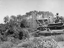 The work involved laying, testing and burying some 310 kilometres (190 mi) of control cable. Each 490-metre (1,600 ft) spool of cable weighed about 1 tonne (1 long ton), so where possible they were pre-positioned. The trenches were dug by a cable plough towed by a Caterpillar D8 tractor. In some cases the limestone was too hard for the plough and the cable was buried by using a grader to cover the cable to the required depth. A similar procedure was followed for laying 2,400 metres (8,000 ft) of power cable. Some 1,300 scaffold frames were erected for mounting instrumentation, held in place by 33,000 anchor pipes. Bunkers ranging in size up to 45 cubic metres (1,600 cu ft) were excavated with explosives and a 10-kilolitre-per-minute (350 cu ft/min) compressor mounted on a four-wheel drive 3-ton Bedford truck connected to the jackhammer part of the 4-inch wagon drill. Explosives were in the form of 2.3-kilogram (5 lb) tubes of plastic explosive left over from a Bureau of Mineral Resources seismic survey of the area. The bunker work proceeded so well that the task force was able to assist KCG with its pit excavation work. Some instrument bunkers contained 3-metre (10 ft) steel cubes. Getting them into the holes was tricky because they weighed 30 long tons (30 t), and the largest available crane was a 25-long-ton (25 t) Coles crane. They were manoeuvred into place with the assistance of a TD 24 bulldozer. The Coles crane was also used to erect the two 30-metre (100 ft) shot towers. Concrete was made in situ, using local quarry dust, limestone and bore water. The Canadians erected metal sheds of a commercial design, which were used to assess blast damage. A tented camp was built for observers at the 11-mile (18 km) post by the 23rd Construction Squadron.[46]