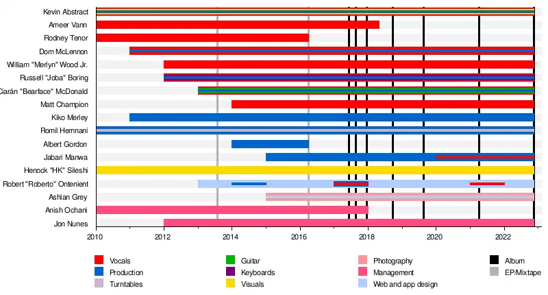 - Kevin Abstract – vocals, production, video direction, creative direction (2010−2022)[86]