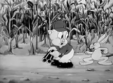 According to Chase Craig, who wrote and drew the first Bugs Bunny comic Sunday pages and the first Bugs comic book, "Bugs was not the creation of any one man; however, he rather represented the creative talents of perhaps five or six directors and many cartoon writers including Charlie Thorson.[9] In those days, the stories were often the work of a group who suggested various gags, bounced them around and finalized them in a joint story conference."[10] A Prototype Bugs rabbit with some of the personality of a finalized Bugs, though looking very different, was originally featured in the film Porky's Hare Hunt, released on April 30, 1938. It was co-directed by Ben "Bugs" Hardaway and an uncredited director Cal Dalton (who was responsible for the initial design of the rabbit). This cartoon has an almost identical plot to Avery's Porky's Duck Hunt (1937), which had introduced Daffy Duck. Porky Pig is again cast as a hunter tracking a silly prey who is more interested in driving his pursuer insane and less interested in escaping. Hare Hunt replaces the little black duck with a small white rabbit. According to Friz Freleng, Hardaway and Dalton had decided to "dress the duck in a rabbit suit".[11] The white rabbit had an oval head and a shapeless body. In characterization, he was "a rural buffoon". Mel Blanc gave the character a voice and laugh much like those he later used for Woody Woodpecker. He was loud, zany with a goofy, guttural laugh.[12] The rabbit character was popular enough with audiences that the Termite Terrace staff decided to use it again.[13]