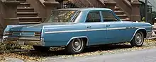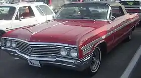 Minor facelifting with new grille and horizontal taillights replacing the 1963's vertical units highlighted the 1964 LeSabre. A somewhat better equipped "Custom" version also joined the lineup this year, easily identifiable by its full length chrome side molding with a brushed metal insert. The regular LeSabre had a narrow trim piece on the rear third of the body.[4] Under the hood, the 401-cubic-inch V8 was replaced in LeSabre sedans and coupes by a smaller 300-cubic-inch V8 designed for the upsized Special/Skylark intermediates that replaced the aluminum V8 in those vehicles. In standard form, the 300 was rated at 210 horsepower with two-barrel carburetor and 9 to 1 compression ratio for use of regular fuel. Optionally available was a 250-horsepower version of the same engine with four-barrel carburetor and higher 11 to 1 compression ratio mandating the use of premium fuel. The LeSabre Estate Wagon came standard with the larger 325-horsepower 401 V8 from the Wildcat and Electra 225 models. Replacing the old Dynaflow-based two-speed automatic transmission were two new Super Turbine automatics. The two-speed Super Turbine 300 (shared with the intermediate-sized cars) was available with the standard two-barrel 300 V8 while the three-speed Super Turbine 400 (shared with other big Buicks and Rivieras) was standard with the 300 four-barrel and optional with the standard engine as well as the 401 in the Estate Wagon. The standard transmission with the base 300 two-barrel V8 was a three-speed column shift manual and a four-speed manual was available as an option with either engine. The new ST300 transmission carried over the variable pitch torque converter from the Dynaflow that had been used since the mid-1950s, while the first year for the ST400 featured a fixed-pitch converter. Inside, only minor trim/upholstery revisions were made.[2]