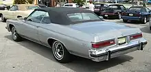 The upscale LeSabre Luxus designation was dropped and replaced by the LeSabre Custom nameplate. 1975 also was the first year of the catalytic converter, and standard high energy ignition which was part of GM's Maximum Mileage System at the time Introduced in September 1974. The 1975 LeSabre was the first to require use of unleaded gasoline, due to the advent of the catalytic converter. The LeSabre lineup offered a coupe and two sedans while the LeSabre Custom lineup offered the coupe, two sedans, and the only convertible in the Buick lineup. 1975 would be the final year for the LeSabre Custom Convertible with around 5,300 examples rolling off the assembly lines. Engine offerings were reduced to just two: the standard 5.7-litre V8 (350 CID) and a four-barrel carburetor or optional 7.5-litre V8 (455 CID) with a four barrel. The 1975 Buick LeSabre now featured a larger, cross-hatched patterned grille which still ran the entire front of the car, dual headlights were once again set side by side instead of individually. Turn signals were located within the front bumper. A Buick tri-shield hood ornament was standard on the Custom Series and optional on the base series. The three-hole 'ventiports' were moved from the hood to the front fenders. Slightly larger but narrower taillamps draped the back of the car with back-up lights positioned in the center broken up by the license plate. Four-door pillared sedans received a new small third windows to emulate the six-window "Colonnade" styling of GM intermediates while four-door hardtop sedans had new opera windows. Inside, a new flat instrument panel shared with Electra and Riviera replaced the wrap-around cockpit dash of previous years and featured a horizontal sweep speedometer that read to only 100 mph compared to 120 mph in previous years and also included kilometer readings. Otherwise, interior trimmings received only minor revisions. Convertible production for both the LeSabre Custom and the Centurion convertibles were not very abundant in the years 1971 to 1975. The rarest production in that time was the 1971 LeSabre Custom with just over 1,800 units built, and the most produced was the 1973 Centurion with slightly over 5,700 units built. Due to this very low production volume and the end of the full-size convertible era, this may make this series of ragtop LeSabre Custom and Centurion Convertibles quite collectable - depending on the vehicles' overall condition. The convertible mechanism used was called the 'scissor top' that folded inward on itself, instead of straight back. This was featured on all GM full-size convertibles from 1971 to 1976.[2]