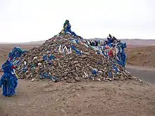 It has given authenticity to the spiritual nature of the mountain. As a result, regular pilgrimage is undertaken by the people to the three sacred major ovoos or stone cairns at the sacred sites along a specified route where Mongolian shamanic worship is offered.[5]: 12 The specified route is unique and covers: Main Ovoo of Heaven at the pinnacle of the mountain via Gurvan Khoriud ("Three Forbidden Precincts"); the Uud Mod ("Two Trees of Entrance"); the Bosgo Tengeriin Davaa ("Threshold Pass of Heaven"); the catchment of the Kherlen River and the Sacred Bogd Rivers; and finally to the Beliin ("Lowest") ovoo.[5]: 12