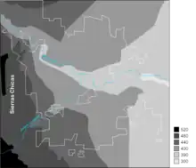 The city is located in the plain of the Humid Pampa, to the east of the oriental cord of Córdoba Hills or Sierras Chicas, also known as the Sierras Cordobesas, which has an average height of 550 m.[6] It spreads at the foot of the mount, on both banks of the River Suquía, and flows into the San Roque reservoir; from there, the Primero River goes east into the plains surrounding the city of Córdoba.