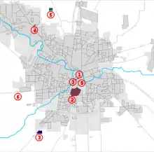 Location of Universities in Córdoba. 1. National University of Córdoba. 2. National Technological University. 3. Catholic University of Córdoba. 4. Blas Pascal University. 5. 21st Century Business University. 6. Aeronautical Universital Institute.