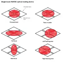 Two optical pick-up designs exist, the original CDM series from Philips use a magnetic actuator mounted on a swing-arm to do coarse and fine tracking. Using only one laser beam and the 4 photodiode block, the servo knows if the track is centered by measuring side-by-side movement of the light of beam hitting on the block and corrects to keep the light on the center.