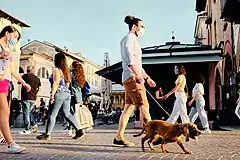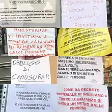 In the night between 7 and 8 March, the government approved a decree to lock down Lombardy and 14 other provinces in Veneto, Emilia-Romagna, Piedmont and Marche, involving more than 16 million people.[131] The decree "absolutely avoided any movement into and out of the areas" and, like the previous one, it provided sanctions of up to three months in prison for those who violated the lockdown.[132] It was possible to move into and out of the areas only for emergencies or "proven working needs", which must be authorised by the prefect.[133] The decree also established the closure of all gyms, swimming pools, spas and wellness centres. Shopping centres had to be closed on weekends, while other commercial activities could remain open if a distance of one metre between customers could be guaranteed.[134] The decree imposed the closure of museums, cultural centres and ski resorts in the lockdown areas and the closure of cinemas, theatres, pubs, dance schools, game rooms, betting rooms and bingo halls, discos and similar places in the entire country.[134] Civil and religious ceremonies, including funeral ceremonies, were suspended. All organised events were also suspended, as well as events in public or private places, including those of a cultural, recreational, sporting and religious nature, even if held in closed places.[135] This measure was described as the largest lockdown in the history of Europe,[136][137] as well as the most aggressive response taken in any region beyond China, and paralysed the wealthiest parts of the country as Italy attempted to constrain the rapid spread of the disease.[138][139]
