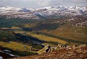 The Monadhliath mountains lie to the north of Strathspey, and comprise a bleak, wide plateau rising to between 700 and 950 m.[10][11]