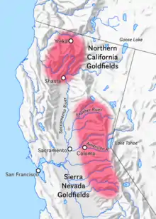 Within a few years, there was an important but lesser-known surge of prospectors into far Northern California, specifically into present-day Siskiyou, Shasta and Trinity Counties.[32] Discovery of gold nuggets at the site of present-day Yreka in 1851 brought thousands of gold-seekers up the Siskiyou Trail[33] and throughout California's northern counties.[34]
