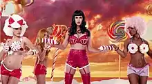 The video was directed by Mathew Cullen and was inspired by the work of Will Cotton, who was also the artistic director of the video.[40][41] Filming of the video began on May 14, 2010. It premiered on June 15, 2010.[42][43] Perry explained the use of a candy theme instead of a beach theme for the video, saying, "It's definitely something to watch when you have the munchies. ... It's all edible. We named it 'Candyfornia' instead of 'California', so it's a different world," she said. "It's not just like, 'Oh, let's go to the beach and throw a party and then shoot a music video!' It's more like, 'Let's put us California Gurls in a whole different world!"[44] The video has been controversial since there were several accusations of plagiarism against Perry, one due to similarities between the video and "Fergalicious" by Fergie, particularly in the sets and the outfits.[45]
