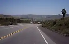 By 1947, US 395 ran concurrently along the portion of SR 78 from Vista to Escondido before continuing along Santa Fe Avenue to Bonsall and Fallbrook and rejoining its alignment during the 1970s. At this time, all of SR 78 that existed had been paved.[49] Before the present-day freeway was built, SR 78 was routed on the Vista Way Freeway (which was an expressway) from Oceanside east to downtown Vista. After this, it followed Santa Fe Avenue and Mission Road east (now signed as CR S14), continuing onto Grand Avenue in Escondido. Following the intersection with US 395, SR 78 turned south on Ash Street and rejoined the current alignment of the highway.[50] In 1949, the rerouting of SR 78 from US 395 to US 99 was listed as a priority by local officials.[51] The road was known for its curves, even though it went over relatively flat terrain; this reduced its efficiency.[52]