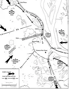 It was not until 20 August that FANK launched Operation Chenla II, its first offensive of the year. The objective of the campaign was to clear Route 6 of enemy forces and thereby reopen communications with Kompong Thom, the Republic's second largest city, which had been isolated from the capital for more than a year. The operation was initially successful, and the city was relieved. The PAVN and Khmer Rouge counterattacked in November and December, annihilating government forces in the process. There was never an accurate count of the losses, but the estimate was "on the order of ten battalions of personnel and equipment lost plus the equipment of an additional ten battalions."[95] The strategic result of the failure of Chenla II was that the offensive initiative passed completely into the hands of PAVN and the Khmer Rouge.