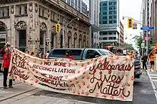The same grievances were aired four years later, after possible unmarked graves of indigenous children were found in late-June 2021, at the site of an Indian residential school in British Columbia.[86][87][88] If not already cancelled or modified due to restrictions related to the COVID-19 pandemic, Canada Day festivities were cancelled in various communities in British Columbia,[89] New Brunswick,[90] and Northern Saskatchewan,[45] while indigenous protest group Idle No More announced its intent to organize peaceful rallies in multiple major cities.[88] Some politicians supported the cancellations,[91][92] while others expressed concern that activists were attacking "the very idea of Canada itself" and hampering progress toward reconciliation.[92]