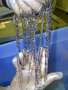 The cane toad begins life as an egg, which is laid as part of long strings of jelly in water. A female lays 8,000–25,000 eggs at once and the strings can stretch up to 20 m (66 ft) in length.[32] The black eggs are covered by a membrane and their diameter is about 1.7–2.0 mm (0.067–0.079 in).[32] The rate at which an egg grows into a tadpole increases with temperature. Tadpoles typically hatch within 48 hours, but the period can vary from 14 hours to almost a week.[32] This process usually involves thousands of tadpoles—which are small, black, and have short tails—forming into groups. Between 12 and 60 days are needed for the tadpoles to develop into juveniles, with four weeks being typical.[32] Similarly to their adult counterparts, eggs and tadpoles are toxic to many animals.[23]