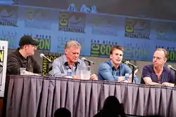 In April 1997, Marvel Studios was in negotiations with Mark Gordon and Gary Levinsohn to produce Captain America, and Larry Wilson and Leslie Bohem were set to write a script.[51] In May 2000, Marvel teamed with Artisan Entertainment to help finance the film.[52] However, a lawsuit arose between Marvel Comics and Joe Simon over the ownership of Captain America copyrights, disrupting the development process of the film. The lawsuit was eventually settled in September 2003.[53] Following the settlement, Marvel was preparing to license the film rights to Warner Bros. until producer David Maisel suggested that the company produce the film themselves.[54] In 2005, Marvel received a $525 million investment from Merrill Lynch, allowing them to independently produce ten films, including Captain America. Paramount Pictures agreed to distribute the film.[52][55][56] Originally, the film would stand alone; producer Kevin Feige said "about half" the movie would be set during World War II before moving into the modern day.[57] Producer Avi Arad said, "The biggest opportunity with Captain America is as a man 'out of time', coming back today, looking at our world through the eyes of someone who thought the perfect world was small-town United States. Sixty years go by, and who are we today? Are we better?" He cited the Back to the Future trilogy as an influence, and claimed he had "someone in mind to be the star, and definitely someone in mind to be the director".[58] In February 2006, Arad hoped to have a summer 2008 theatrical release date.[59] Jon Favreau approached Arad to direct the film as a comedy, but he chose to make Iron Man instead.[60] In April 2006, David Self was hired to write the script.[61] He explained that Captain America was his favorite superhero as a child because "my dad told me I could one day be Captain America".[62] Joe Johnston met with Marvel to discuss directing the film.[63]