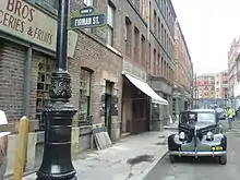 Principal photography began on June 28, 2010,[88] with the working title FrostBite.[89] On the same day, Marvel confirmed that Lee Jones had been cast to play US Army Colonel Chester Phillips.[17] The next day Marvel confirmed that Cooper would portray the younger version of Howard Stark, the character played by John Slattery in Iron Man 2.[90] It was announced that the film would shoot in London in late July and was expected to include scenes featuring key London landmarks.[91] War scenes were filmed in September at the former Royal Navy Propellant Factory in the Welsh village of Caerwent.[92][93] Filming was scheduled to take place that month in the Northern Quarter of Manchester, where parts of the 2004 film Alfie and the 2009 Sherlock Holmes had been shot,[94] followed by the Stanley Dock area of Liverpool, both doubling for the period's Lower East Side of Manhattan.[95] Further scenes were scheduled to be shot in Liverpool's Albert Dock.[96] Johnston included a scene of a technology fair that includes in passing a display case containing the 1940s android superhero known as the original Human Torch, another character, like Captain America, in comics published by Marvel Comics' predecessor, Timely Comics.[97]
