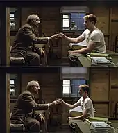 Most of the shots were done by an L.A. company called LOLA that specializes in digital "plastic surgery". The technique involved shrinking Chris in all dimensions. We shot each skinny Steve scene at least four times; once like a normal scene with Chris and his fellow actors in the scene, once with Chris alone in front of a green screen so his element could be reduced digitally, again with everyone in the scene but with Chris absent so that the shrunken Steve could be re-inserted into the scene, and finally with a body double mimicking Chris's actions in case the second technique were required. When Chris had to interact with other characters in the scene, we had to either lower Chris or raise the other actors on apple boxes or elevated walkways to make skinny Steve shorter in comparison. For close-ups, Chris' fellow actors had to look at marks on his chin that represented where his eyes would be after the shrinking process, and Chris had to look at marks on the tops of the actor's head to represent their eyes. ... The second technique involved grafting Chris's head onto the body double. This technique was used mostly when Chris was sitting or lying down, or when a minimum of physical acting was required....[107]