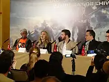 In July 2013, Marvel Studios released a teaser poster depicting a damaged and discolored Captain America shield. The Los Angeles Times said, "the image suggests that [Captain America] might see some serious battle in the sequel" while Rolling Stone said, "the image hints at darker themes in the sequel".[135][136] Later that month, Marvel Studios head and producer Kevin Feige, directors Joe and Anthony Russo, and cast members Chris Evans, Scarlett Johansson, Samuel L. Jackson, Sebastian Stan, Anthony Mackie, Cobie Smulders, Emily VanCamp, and Frank Grillo held a panel at 2013 San Diego Comic-Con International and presented footage from the film.[137] In addition, Marvel had booths depicting a Smithsonian-type exhibit showing Captain America and the Howling Commandos from Captain America: The First Avenger.[138] At the end of the month, audiences were shown a glimpse of the film along with some of Marvel's other Phase Two slate of films at Disney XD's Disney Fandom event.[139]