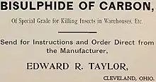It can be used in fumigation of airtight storage warehouses, airtight flat storage, bins, grain elevators, railroad box cars, ship holds, barges and cereal mills.[22] Carbon disulfide is also used as an insecticide for the fumigation of grains, nursery stock, in fresh fruit conservation and as a soil disinfectant against insects and nematodes.[23]